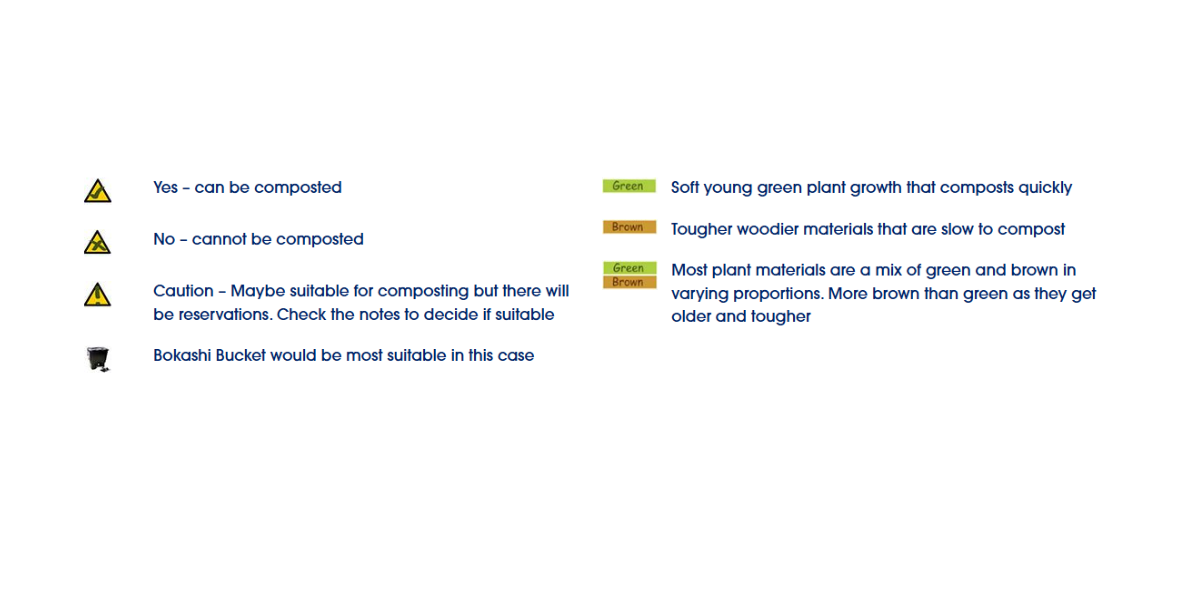 Compostable materials are usually divided into two groups, green and brown. Greens are soft young green plant growth that are quicker to compost and browns and tougher materials that are slower to compost.